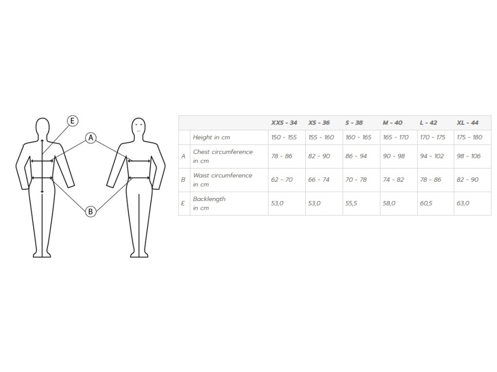 - Velikosti : viz přiložená tabulka, nebo orientačně S = 158 - 168 cm a 50 - 59 kg / M = 165 - 172 cm a 60 - 69 kg / L = 170 - 175 cm a 70 - 80 kg / XL 174+ cm a 80 kg a více. V případě, že váháte nad velikostí poporučujeme z praxe volit velikost spíše větší. Rozdíl na délku zádového panelu je mezi velikostni pouze cca 3 cm.