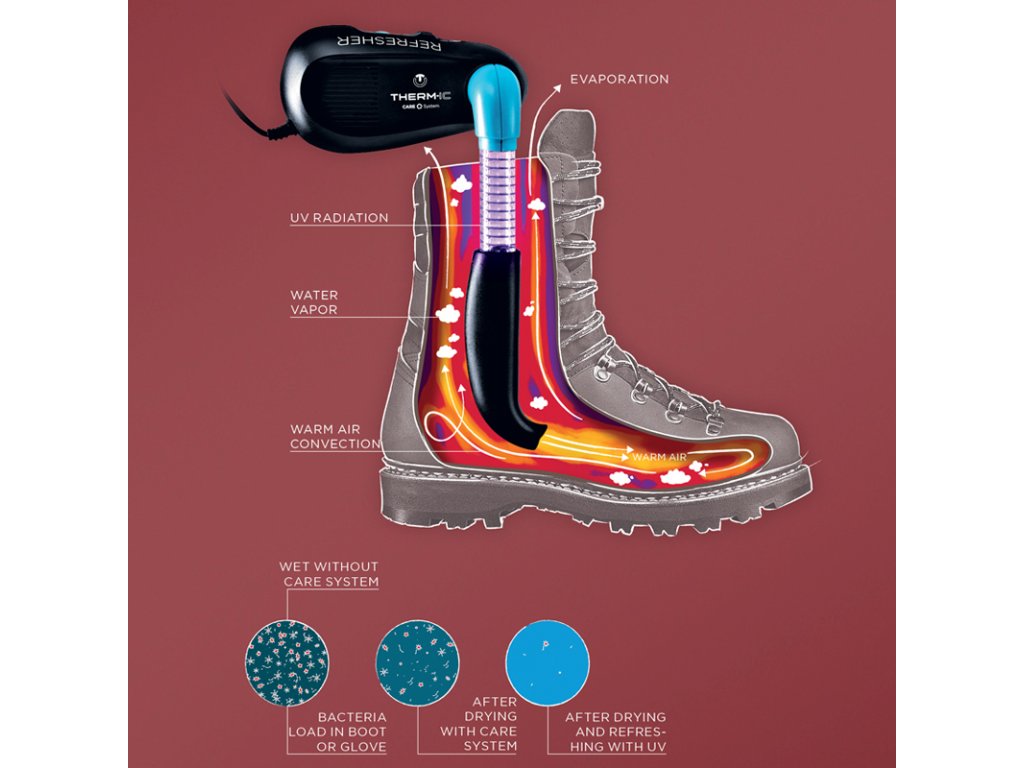 Výkonný vysoušeč obuvi s ventilátorem, UV světlem pro antibakteriální účinek a nastavitelným časovačem. Napájení 220 V. Efektivní vysoušeč, který pomocí motoru vhání proud teplého vzduchu do lyžařské i klasické obuvi nebo rukavic. Jednoduše a šetrně vysuší promáčené nebo propocené boty nebo rukavice během několika hodin. Nejen že mokrou výbavu vysušíte, ale také výrazně utlumíte problém s nepříjemným zápachem (to i díku UV světlu, které zabíjí bakterie). Model Refresher má navíc časovač, po zvoleném intervalu (1, 3 nebo 6 hodin) se vypne.